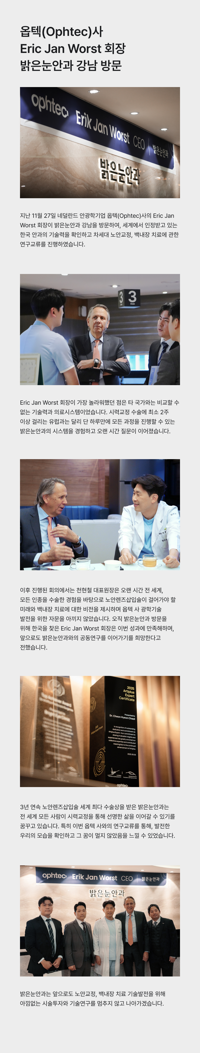 지난 11월 27일 네덜란드 안광학기업 옵텍(Ophtec)사의 Eric Jan Worst 회장이 밝은눈안과 강남을 방문하여, 세계에서 인정받고 있는 한국 안과의 기술력을 확인하고 차세대 노안교정, 백내장 치료에 관한 연구교류를 진행하였습니다. Eric Jan Worst 회장이 가장 놀라워했던 점은 타 국가와는 비교할 수 없는 기술력과 의료시스템이었습니다. 시력교정 수술에 최소 2주 이상 걸리는 유럽과는 달리 단 하루만에 모든 과정을 진행할 수 있는 밝은눈안과의 시스템을 경험하고 오랜 시간 질문이 이어졌습니다. 이후 진행된 회의에서는 천현철 대표원장은 오랜 시간 전 세계, 모든 인종을 수술한 경험을 바탕으로 노안렌삽입술이 걸어가야 할 미래와 백내장 치료에 대한 비전을 제시하며 옵텍 사 광학기술 발전을 위한 자문을 아끼지 않았습니다. 오직 밝은눈안과 방문을 위해 한국을 찾은 Eric Jan Worst 회장은 이번 성과에 만족해하며, 앞으로도 밝은눈안과와의 공동연구를 이어가기를 희망한다고 전했습니다. 3년 연속 노안렌즈삽입술 세계 최다 수술상을 받은 밝은눈안과는 전 세계 모든 사람이 시력교정을 통해 선명한 삶을 이어갈 수 있기를 꿈꾸고 있습니다. 특히 이번 옵텍 사와의 연구교류를 통해, 발전한 우리의 모습을 확인하고 그 꿈이 멀지 않았음을 느낄 수 있었습니다. 밝은눈안과는 앞으로도 노안교정, 백내장 치료 기술발전을 위해 아낌없는 시술투자와 기술연구를 멈추지 않고 나아가겠습니다.