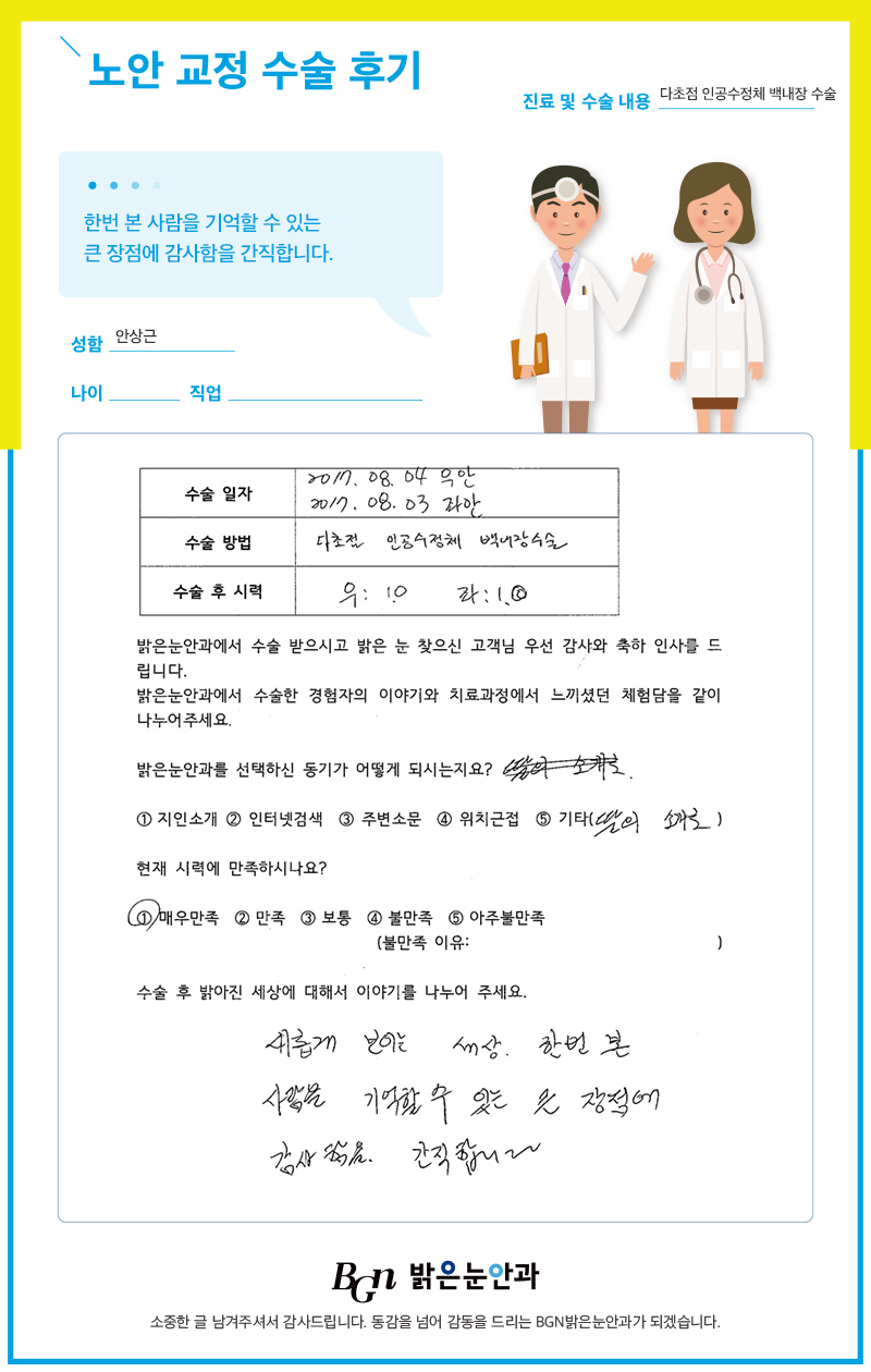 30년 가까이 안경과 렌즈에 의지하여 살아가던 나에게 불편함을 해소시켜 준 밝은눈안과