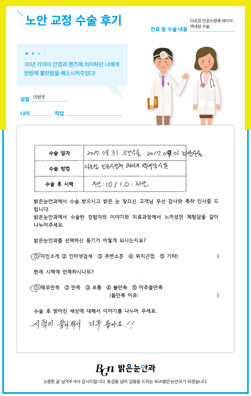 30년 가까이 안경과 렌즈에 의지하여 살아가던 나에게 불편함을 해소시켜 준 밝은눈안과
