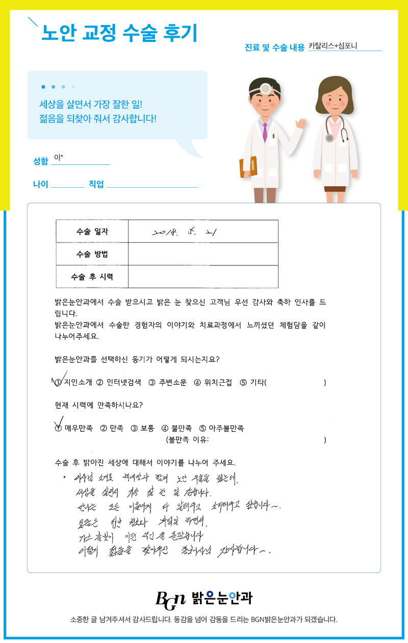 밝은눈안과에서는 본원의 주소 고객님의 휴대폰으로 발송을 위해 아래와 같이 개인정보를 수집하고 있습니다. 필수 : 이름, 휴대폰 번호 이용 기간 : 수집일로 부터 1년(고객 철회 요구시 즉시 파기)