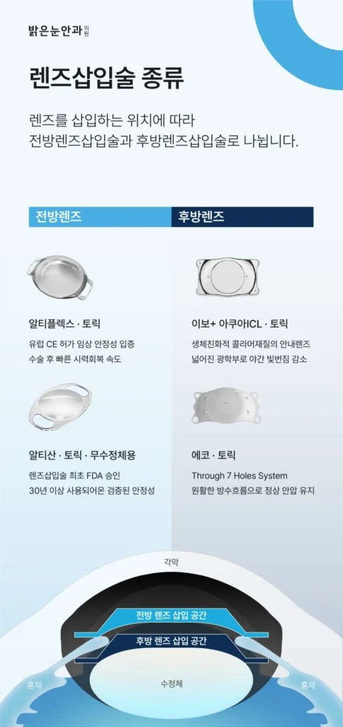 렌즈 삽입술은 다양한 장점이 있는데요. 수정체를 교체하는 방식의 경우, 향후 발생할 수 있는 백내장을 영구적으로 예방하거나 이미 진행 중인 백내장을 치료할 수 있으며 한 번 삽입한 렌즈는 특별한 합병증이 없는 한 교체할 필요 없이 평생 시력을 유지해 줍니다.
