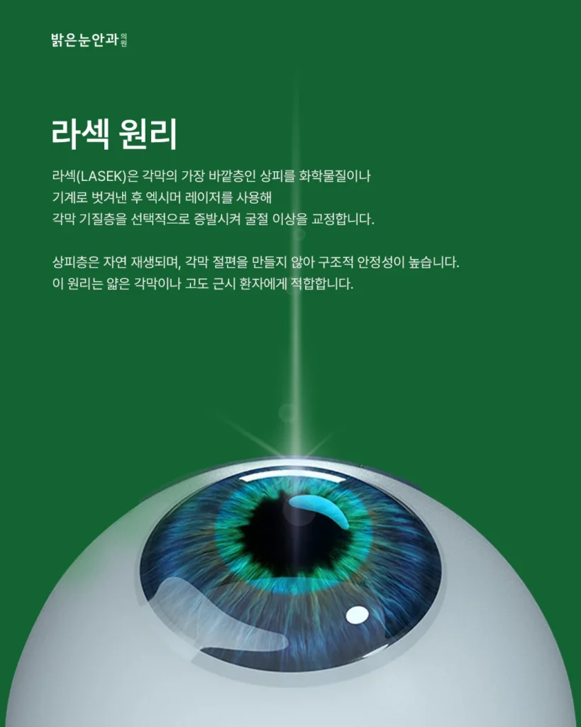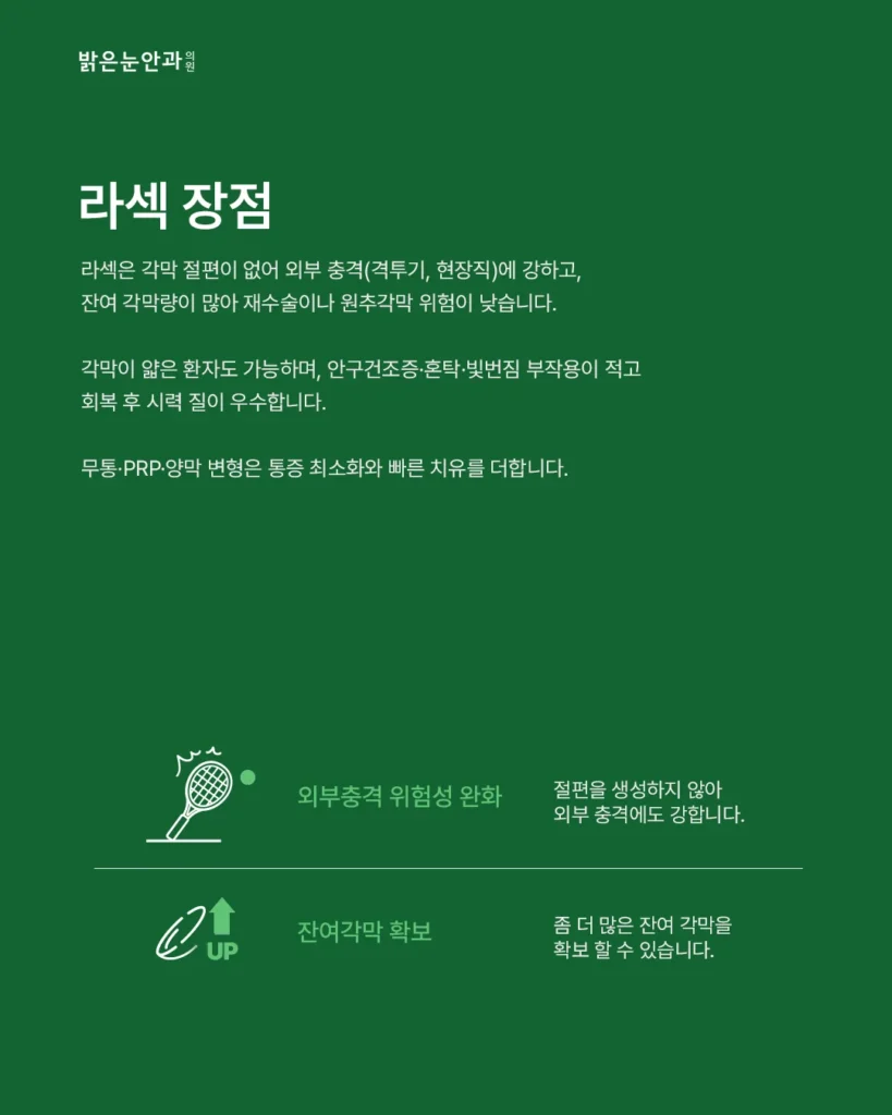 라섹 수술은 각막 상피를 제거한 후 레이저로 시력을 교정하는 방식으로, 각막 절편을 만드는 라식에 비해 외부 충격에 강하고 안정성이 높다는 평가를 받습니다.