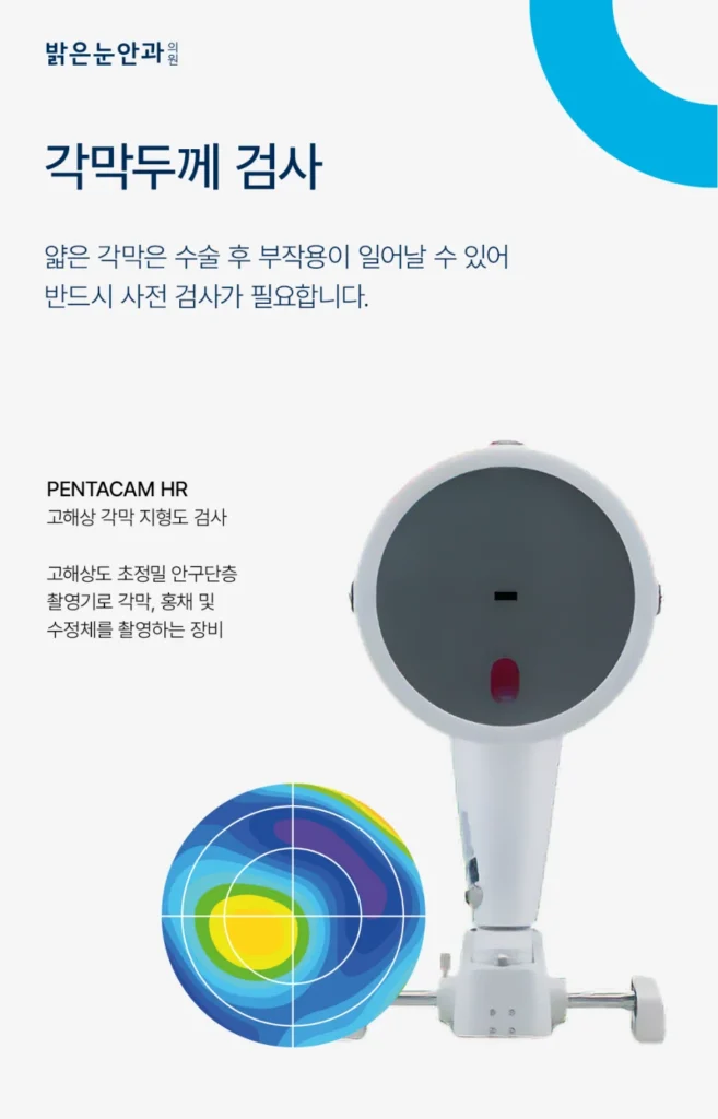 각막 두께 측정은 수술 후 남게 될 ‘잔여 각막량’을 계산하기 위한 필수 검사로 각막이 너무 얇으면 수술이 불가능하거나 라섹 등 다른 대안을 찾는 것이 좋습니다. 각막 지형도 검사의 경우 각막의 전면과 후면 모양을 3D로 시각화하는데요. 각막이 원뿔 모양으로 튀어나오는 원추각막 등 잠재적인 위험 요소를 걸러내는 데 결정적인 역할을 합니다.